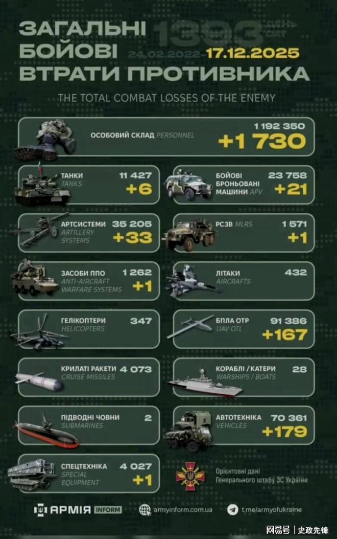 今天是12月17日,乌克兰卫国战争第1393天。欢迎来到我们的俄罗斯-乌克兰战争部分。北京时间今天14点,乌克兰总参谋部才发布了12月16日的战报。俗话说“久等有好饭吃”。当然,最近24小时内,乌克兰武装部队共歼敌1730人,相当于一天之内歼灭俄军4个营,为近来最高。一如既往,让我们首先将注意力集中在血与火的领域。 16日开始,俄罗斯北方集群开始兵力分成两路,向乌克兰苏梅州边境发动攻击。东线俄军继续向奥莱克西耶夫卡东侧进攻,并沿森林防线向南推进。乌克兰军队发起反击。双方仍在交火……俄军向西缓慢推进在前方,包围了Andrivka村,然后占领了Jindraj。乌克兰军队立即对安德里夫卡的俄军发起反击,但由于俄军加大了炮火密度,反击并未成功,失去了机会。地理图像显示,俄军昨天控制了苏梅边境3.84平方公里。至此,北线苏梅至沃尔夫昌斯克至库皮扬斯克,到顿巴斯地区利曼至锡韦尔斯克至康斯坦丁尼夫卡至波克罗夫斯克至第聂伯罗彼得罗夫斯克,再至南线扎波罗热至赫尔松的1250公里联络线互换。很多网友好奇,俄军为何发动大规模冬季攻势?物流能跟上吗?任何军事和经济活动都是为政治服务的。俄罗斯此举无非是给正在进行的美乌、美欧谈判施加压力。公开,并警告多方不要忽视莫斯科的利益。至于影响,一天之内伤亡1730人就是最好的描述。乌克兰军方报道称:俄罗斯武装部队投资了各种令人难以置信的运输车辆来支持后勤,包括骡子、拖拉机、手推车和偷来的车辆。我们在一些困难地区主要使用地面无人运输系统……俄军的一些攻击纯属编造。昨天的顿巴斯战场,俄军再次投入骑兵,结果再次全军覆没。在现代战场上,不受保护的骑兵会造成生命损失。波克罗夫斯克方向,俄军加大了对“大小米城”的攻击力度。西南方向的俄军在越过M30高速公路后,试图夺取乌克兰军队的格里申后勤基地。他们遭到乌克兰无人机和大炮的严重破坏。 10多辆汽车被炸毁40名俄罗斯士兵当场死亡。看来乌克兰军队已经在城内建立了炮兵阵地。在炮兵的大规模破坏下,俄军很难集结兵力发起猛烈进攻。但仅靠轻步兵突防是不可能取得有效的战术胜利的。昨天,乌克兰陆军第四特种作战特遣部队“Poprivse”清理了乌达赫内北部的布雷区,没有造成人员伤亡,并杀死了埋在该地区的20多名俄罗斯士兵。乌克兰陆军第7集团军12月16日报道:俄军在波克罗夫斯克市西郊最为活跃,正试图控制西北部的赫里什内。俄军还加大了对米尔诺市东南部的压力。敌军从多个方向向赫里希尼移动。渗透,我们通过切断敌人的渗透企图来摧毁敌人的渗透企图。俄罗斯军队的移动路线,并与火炮和FPV无人机进行联合打击。在米尔诺赫德东南部,我国防军会同海军陆战第38旅及时发现并清除了该地。国防军将继续采取措施扩大通往米尔诺的后勤走廊。相关报道:多家欧美媒体16日报道称,俄罗斯乌拉尔原油价格跌至每桶40美元,为战争爆发以来的最低水平。西方制裁迫使俄罗斯继续压低原油价格。德国国防部长鲍里斯·皮斯托利斯16日在“拉姆斯坦模型”会议上证实,德国将于2026年初从联邦国防军库存中向乌克兰转移大量“响尾蛇”导弹……该导弹最初设计为空空导弹,但乌克兰工程师将其改为地空导弹。在这场战争中,美国的研发和创造力克莱因人给世界留下了深刻的印象。摩尔多瓦总理亚历山德鲁·蒙泰亚努12月16日发表声明称,俄罗斯卢克石油公司位于基希讷乌国际机场的资产将在20天内被国有化,因为该公司未能满足资产出售要求。声明称:这一决定是在摩尔多瓦国家安全投资审查委员会拒绝卢克石油公司在摩尔多瓦业务扩张的一个多月后做出的,该决定因美国对资产出售谈判管理的制裁而受到阻碍。作为一个人口超过200万的小国,摩尔多瓦长期以来对俄罗斯心存畏惧、容忍。现在它竟然敢公然入侵俄罗斯,并没收其在俄罗斯的资产。这意味着什么?乌克兰无人艇在新罗西斯克港击沉俄罗斯黑海舰队“华沙之歌”级潜艇后,俄罗斯予以强烈否认。俄罗斯国防部下属的“红星”电视台也报道了并发布视频证明俄罗斯潜艇并未被乌克兰无人艇击中。不过,很快网友们就发现该视频是假的。最大的缺陷是背景的雪,因为新罗西斯克港没有雪。显然,这段视频并不是在新罗西斯克港拍摄的,而是在其他也部署有“华沙之歌”级潜艇的军港拍摄的。此次被乌克兰无人艇击中的“华沙之歌”号潜艇是黑海舰队仅存的两艘潜艇之一,但另一艘潜艇不具备发射“口径”巡航导弹的能力。随着潜艇受损严重,黑海舰队已经不再具备发射“口径”巡航导弹攻击乌克兰潜艇的能力……由于土耳其在战争爆发后封锁了该海峡,俄罗斯其他舰队的舰艇都无法进入黑海。感谢您的阅读,欢迎留下宝贵意见